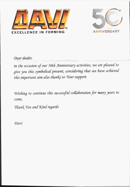 50年砥礪前行,50年春華秋實(shí)。2016年10月,將迎來(lái)Davi公司建廠50周年的喜慶日子。為了熱烈慶祝Davi建廠50周年,Davi公司特邀全球代理商和客戶(hù)前往意大利參加50周年慶典,我們蘇州哈利機(jī)械設(shè)備有限公司作為意大利Davi在國(guó)內(nèi)代理商將會(huì)榮幸受邀參加!